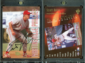 I was able to add these four in-person autographs to the collection this month via a single seller on ebay. Pictured here are: 1994 Classic Best Gold #120, 1995 Reading Phillies Eastern League Champs Team Issue #NNO, 1995 Reading Phillies Eastern League Champs Nabisco #NNO, and 1996 Best Reading Phillies - Fairgrounds Square #21. What I absolutely love about these cards is that each of them are "period correct" signatures. They were signed soon after the cards were issued as you can tell that by Rolen's early signature on each of the cards. I tend to think that I'm enough of an expert with regard to Rolen's signature over the years that I felt comfortable picking these up without any third party authentication. While I don't count these cards in my "unique card total" count, I still love them just the same because they were signed early on in Rolen's career.